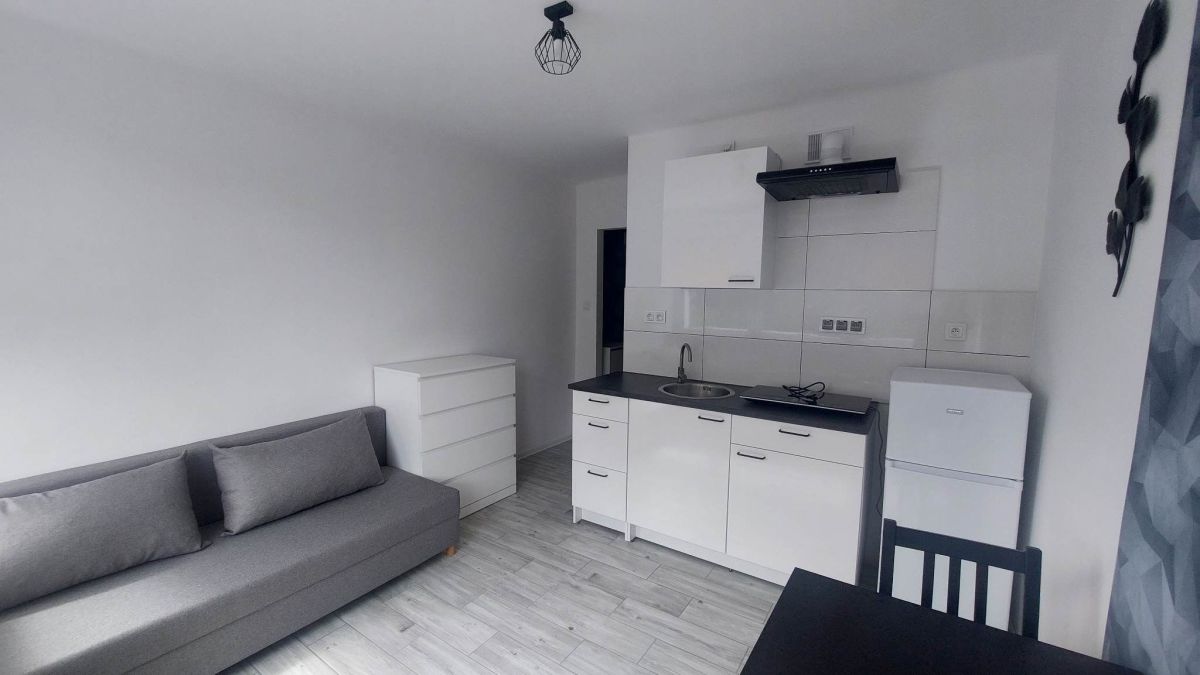 - pokój z aneksem kuchennym: podłoga gres, ściany gładź malowana i tapeta, płyta elektryczna, lodówka, meble kuchenne, komoda z szufladami, stół i 2 krzesła