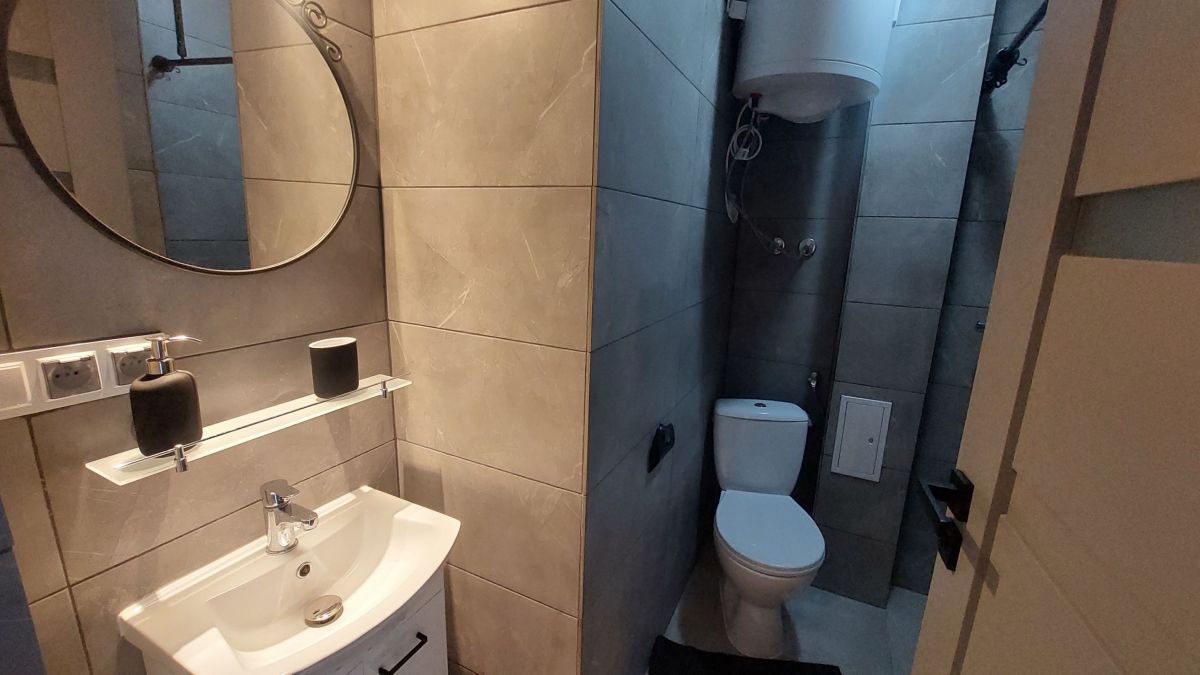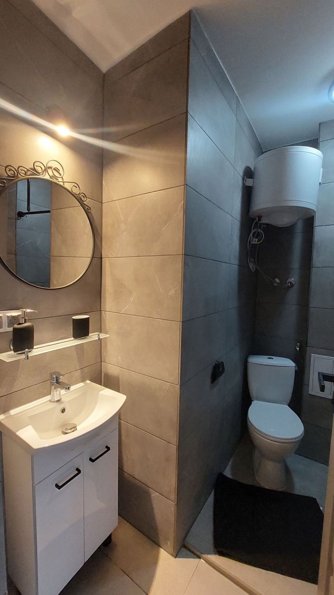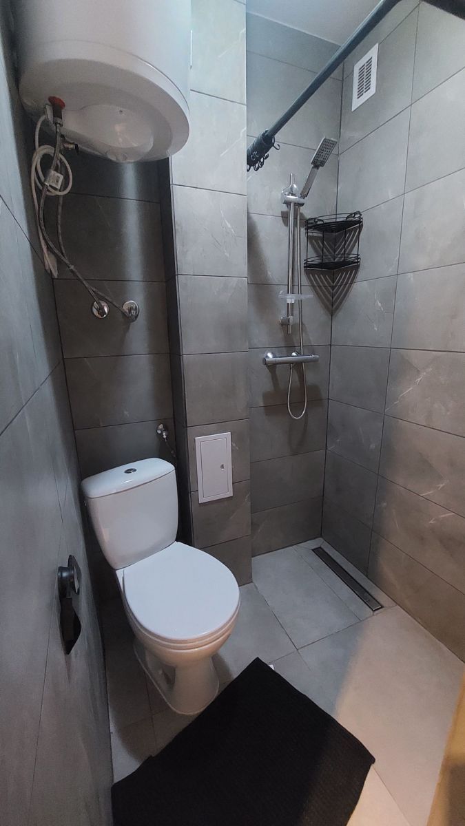 - łazienka z wc: ściany gres, podłoga gres, prysznic z odpływem liniowym, pralka
