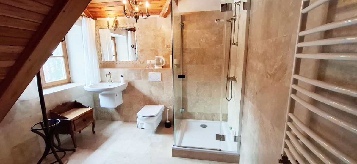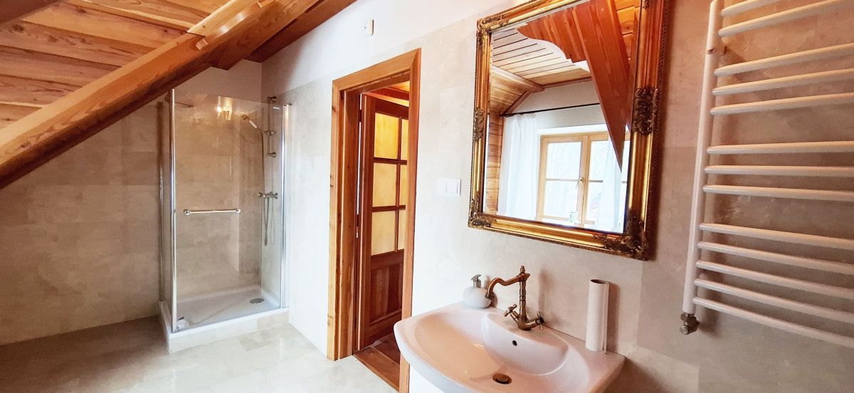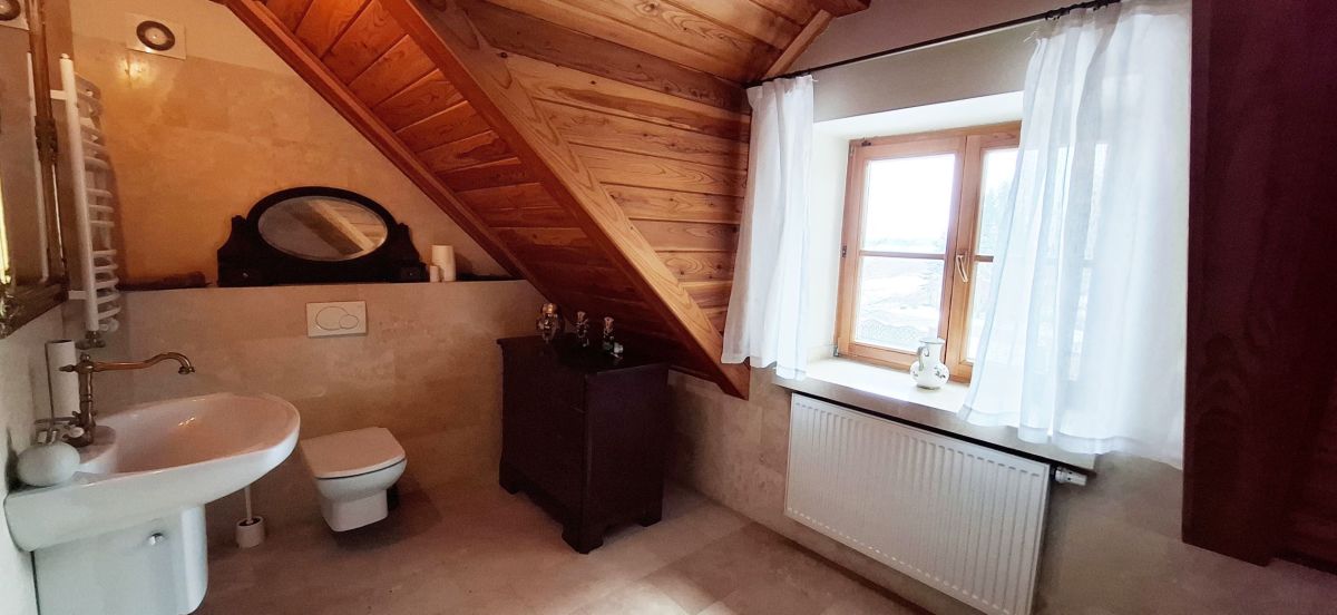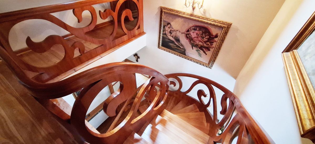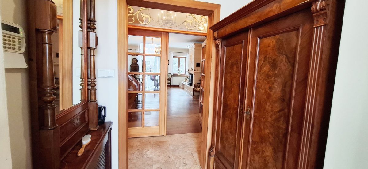 Na parterze domu znajdują się wiatrołap, kotłownią, hall komunikacyjny, salon z pięknym stylowym kominkiem z wyjściem na taras, gabinet, 2 pokoje z łazienkami, kuchnia z jadalnią, przepięknie ręcznie robione drewniane schody prowadzące na poddasze domu. Na poddaszu znajduje się hall komunikacyjny z biblioteką, trzy sypialnie z łazienkami, pokój gospodarczy - pralnia z suszarnią.