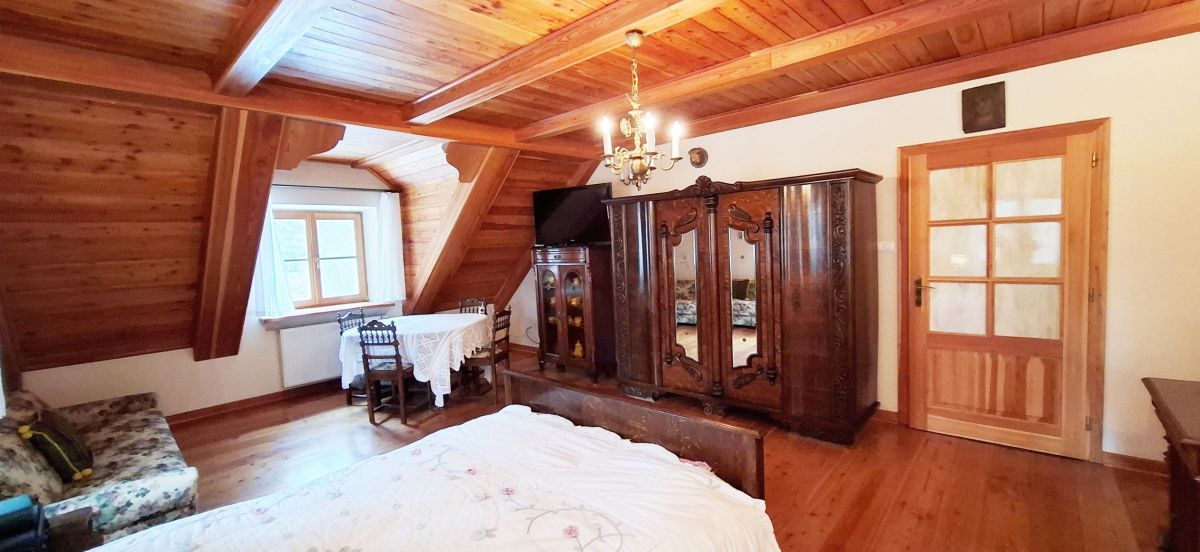 Dodatkowe budynki: garaż murowany wolnostojący o wymiarach 8/6 m, dwu stanowiskowy z pomieszczeniem gospodarczym z przeznaczeniem na saunę, drewutnia. W domu w pokojach i przedpokojach podłogi deska modrzew, ściany gładź malowana, sufity drzewo modrzewiowe, w łazienkach podłoga i ściany wysokiej jakości kamień szlachetny TRAWERTYN oraz gładź malowana.