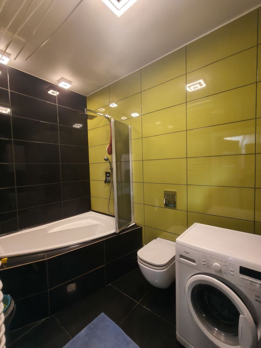 - łazienka z wc: ściany glazura, podłoga terakota, wanna, pralka