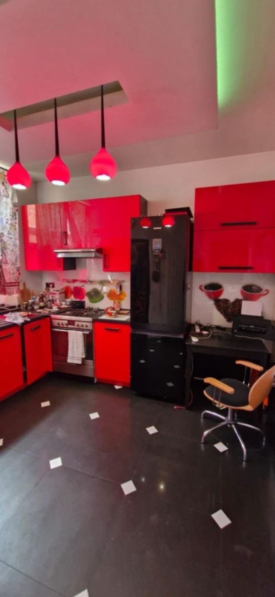 - kuchnia widna: ściany gładź malowane, szkło ozdobne, podłoga terakota; lodówka, kuchenka gazowa z piekarnikiem, szafki kuchenne