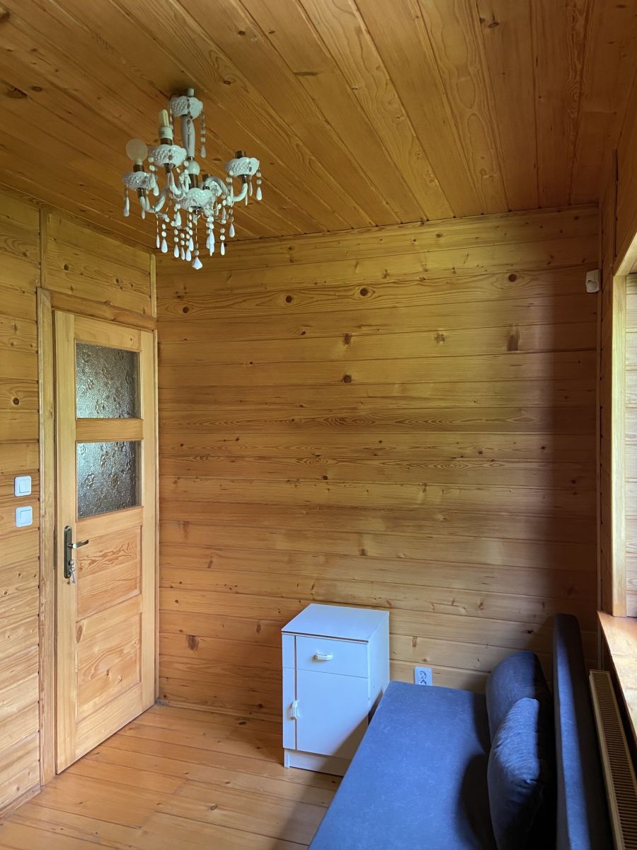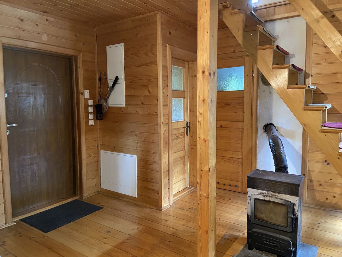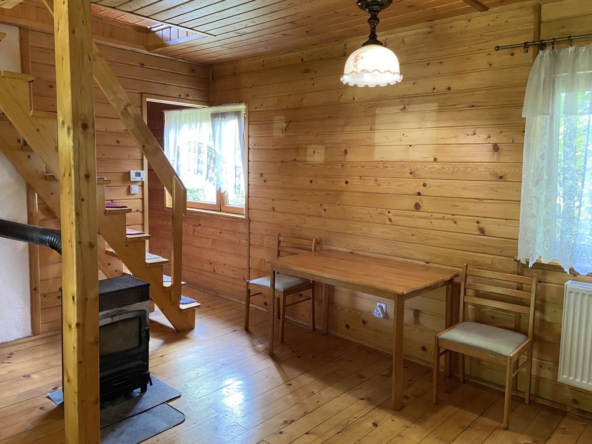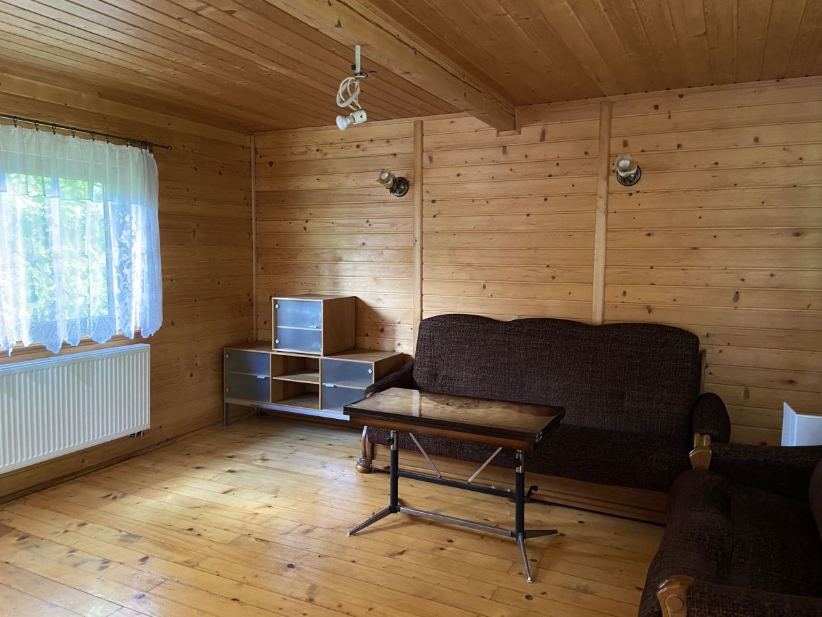 - pokój dzienny: podłoga drewno, ściany drewno, piec kominkowy