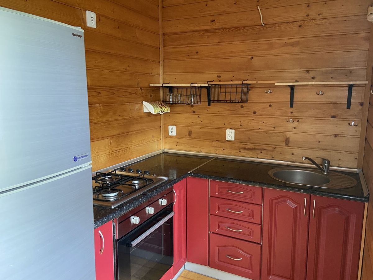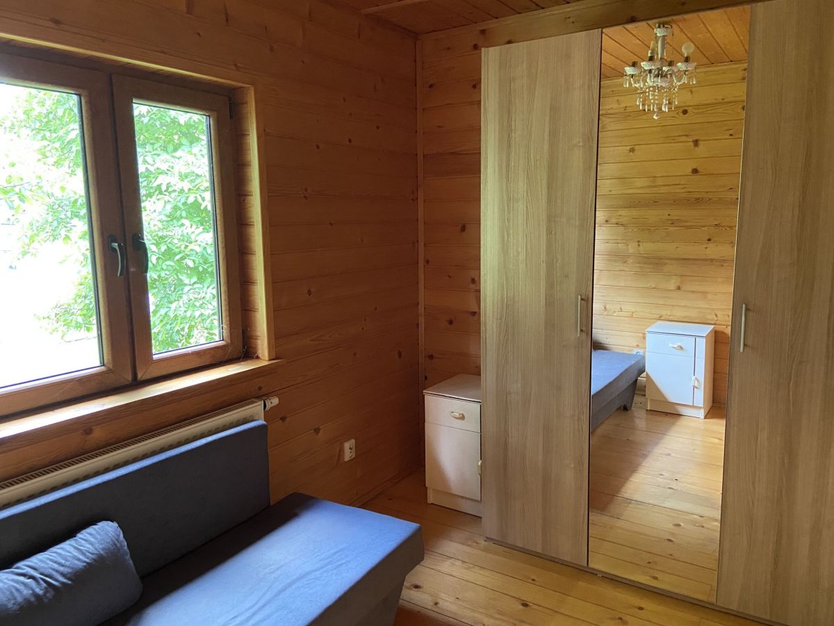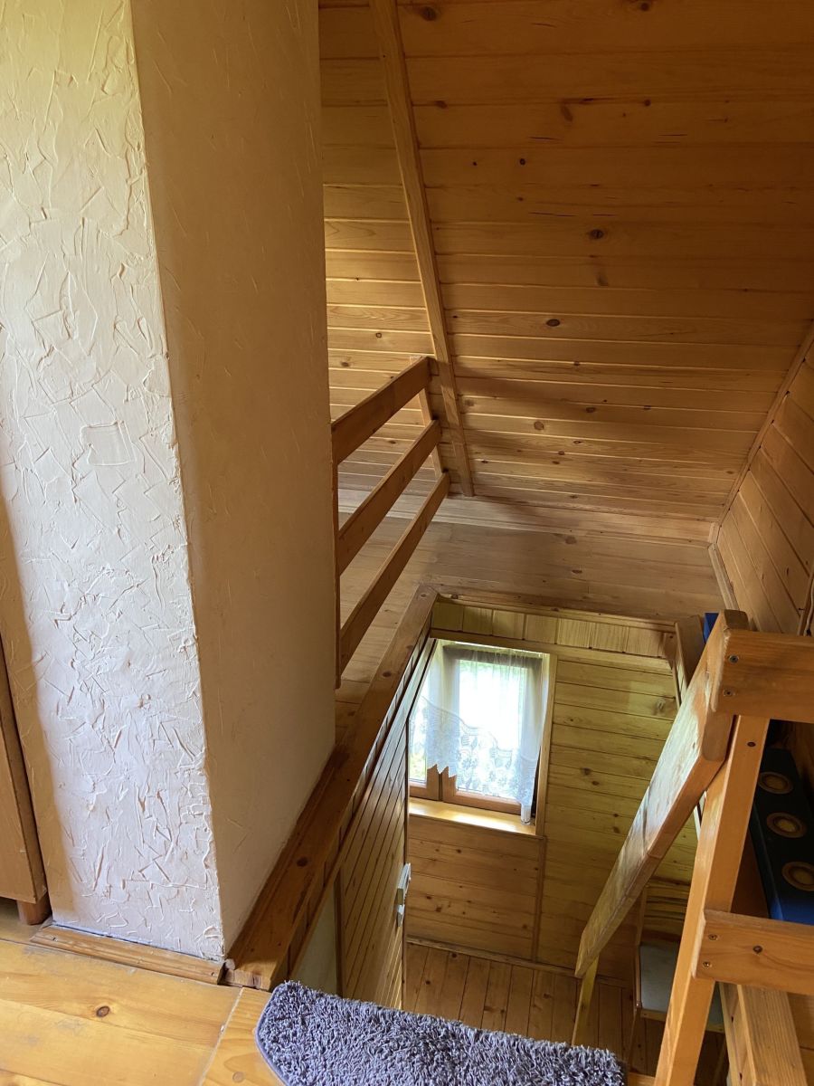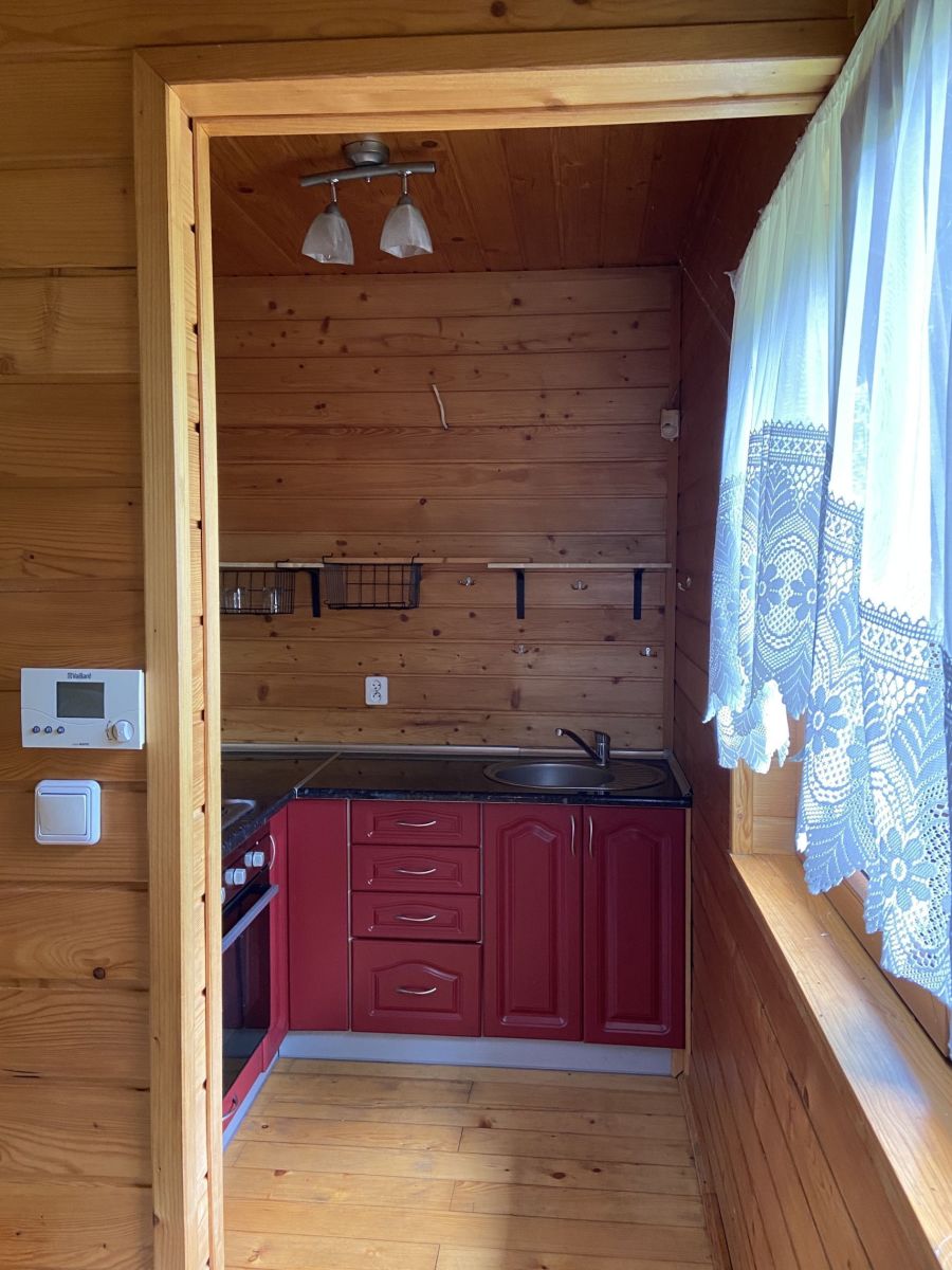 - pokój dzienny: podłoga drewno, ściany drewno, piec kominkowy