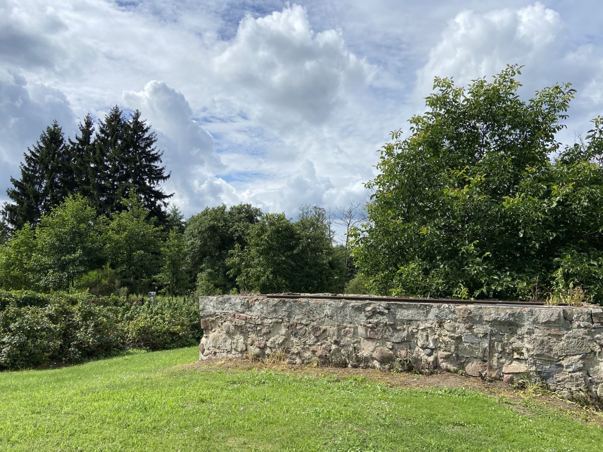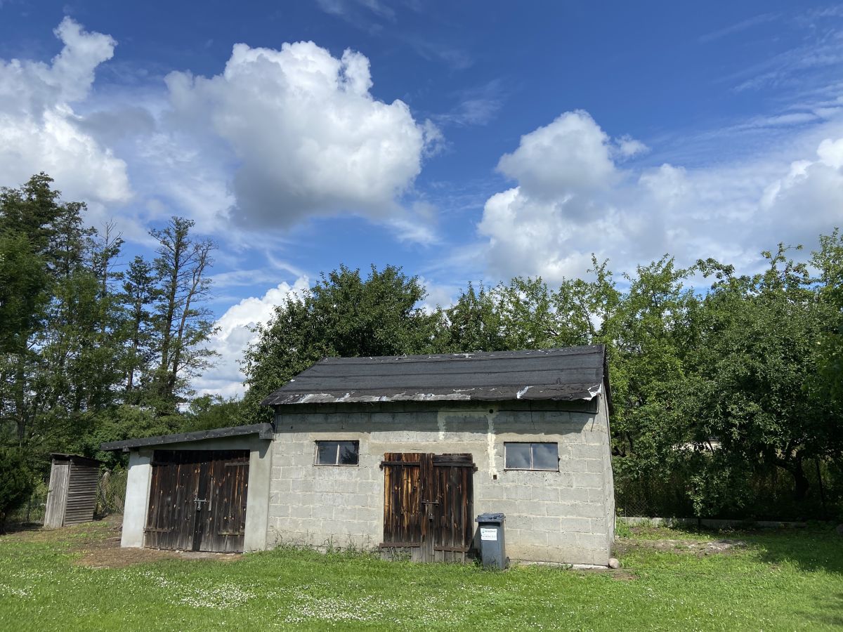 Dodatkowe budynki na działce: garaż, pomieszczenie gospodarcze i półziemianka kamienna bez dachu.