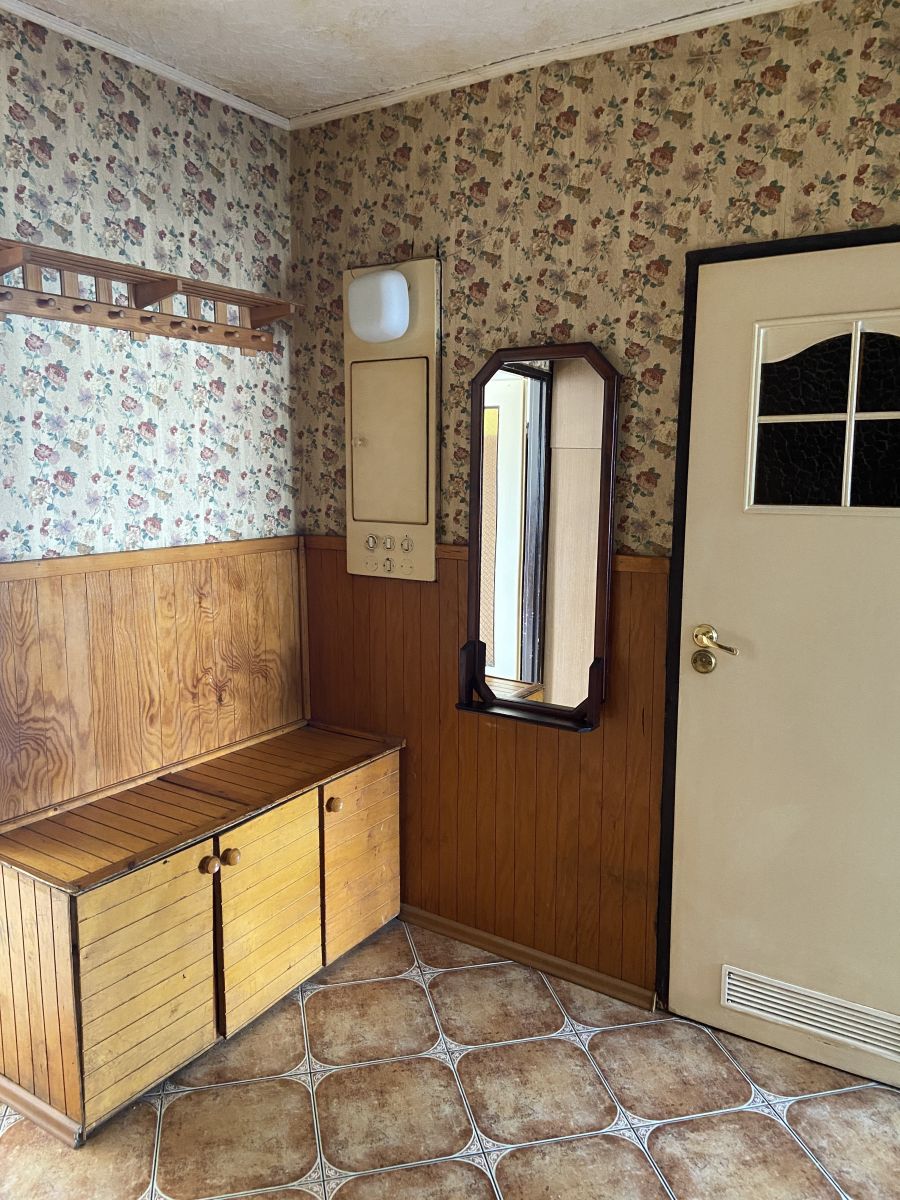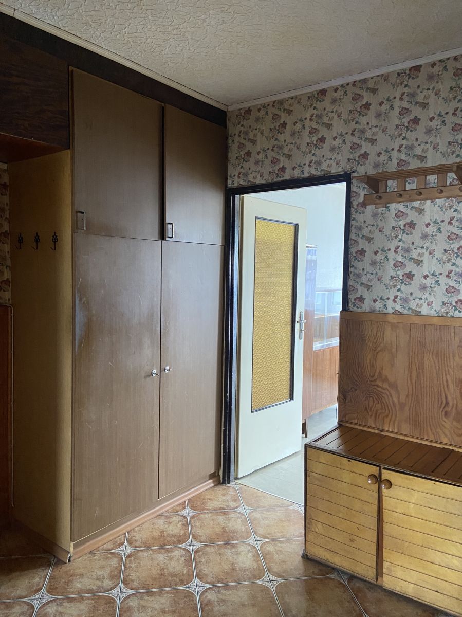 - przedpokój: podłoga terakota, ściany tapeta i drewno, pawlacz