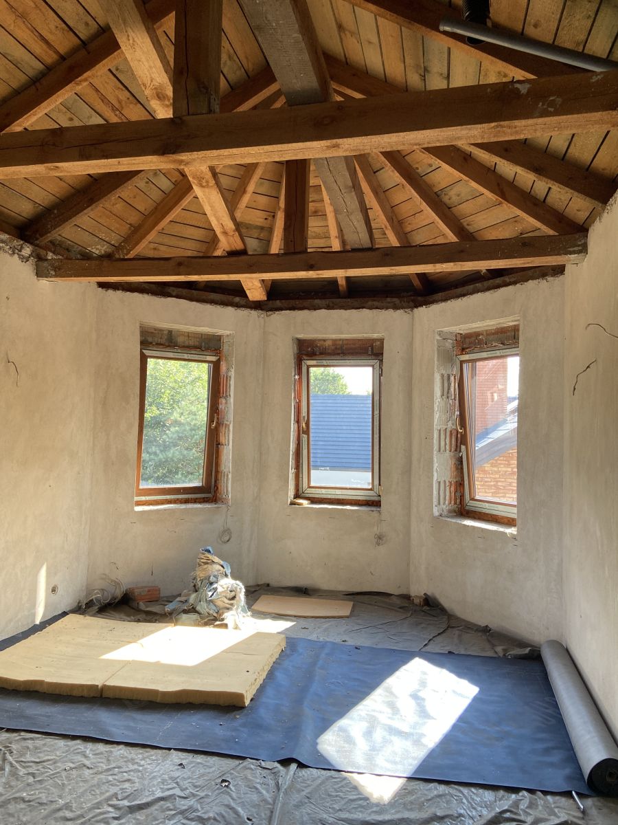 - podział na salon, 5 pokoi (w tym 4 z balkonami) i wc, podłoga wylewka, ściany tynki, rozprowadzona instalacja elektryczna i hydrauliczna, dach nieocieplony