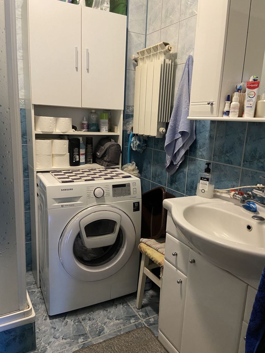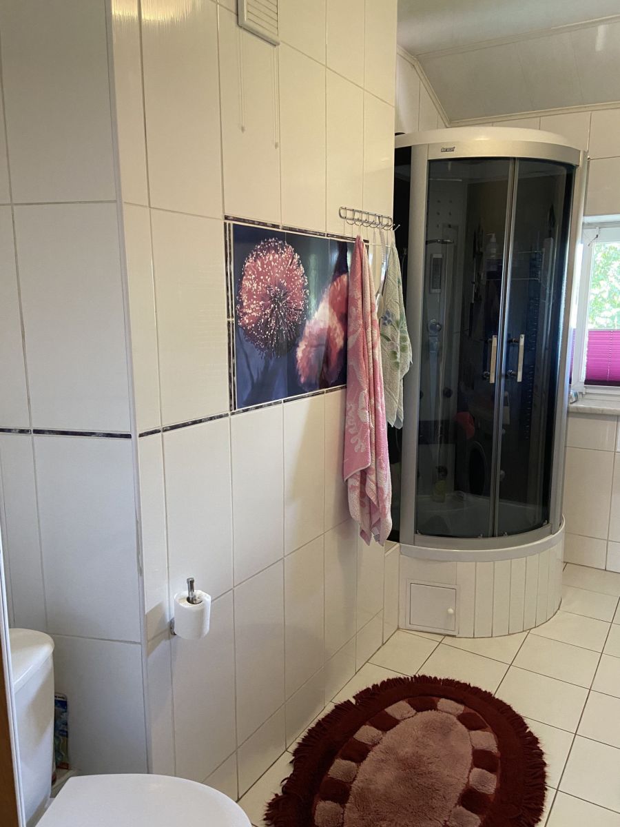 - łazienka z wc: podłoga terakota, ściany glazura, kabina prysznicowa