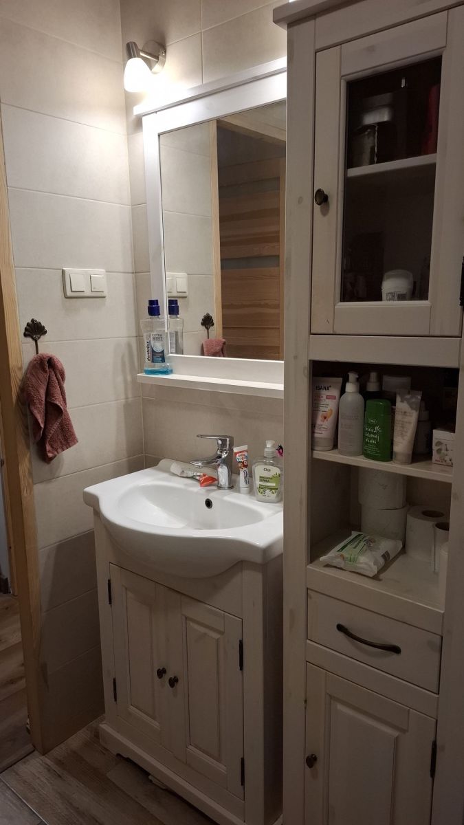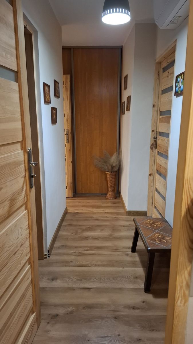 - przedpokój: podłoga panel, ściany gładź, szafa