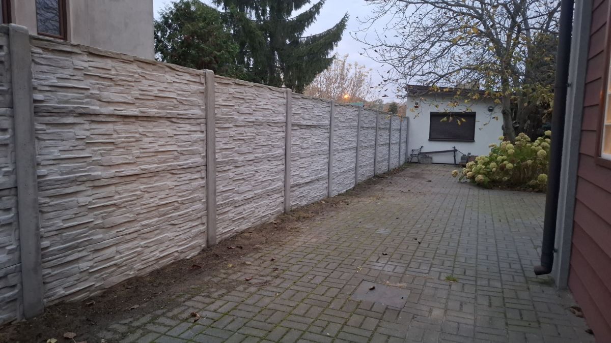 Ogrodzenie: beton, siatka; brama automatyczna z kamerą i domofonem
