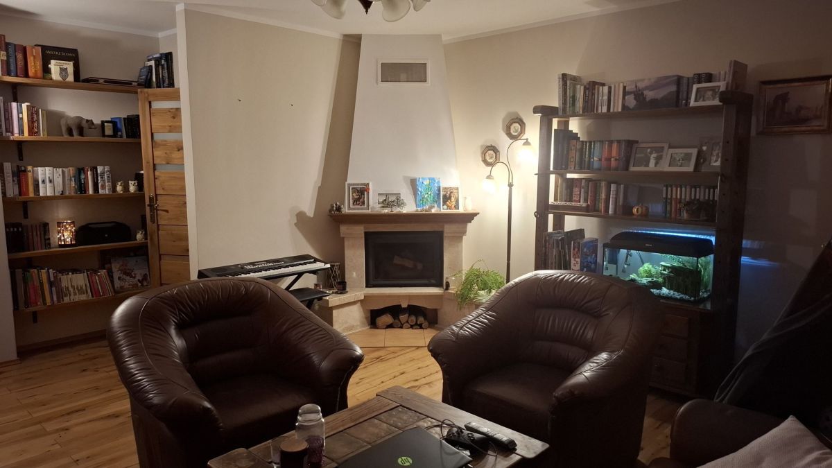 - salon: podłoga deska barlinecka, ściany gładź, kominek bez rozprowadzenia