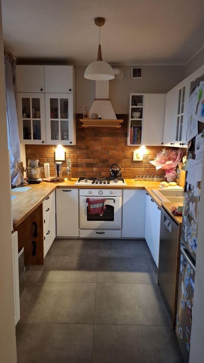 - kuchnia: podłoga gres, ściany gładź i imitacja cegły