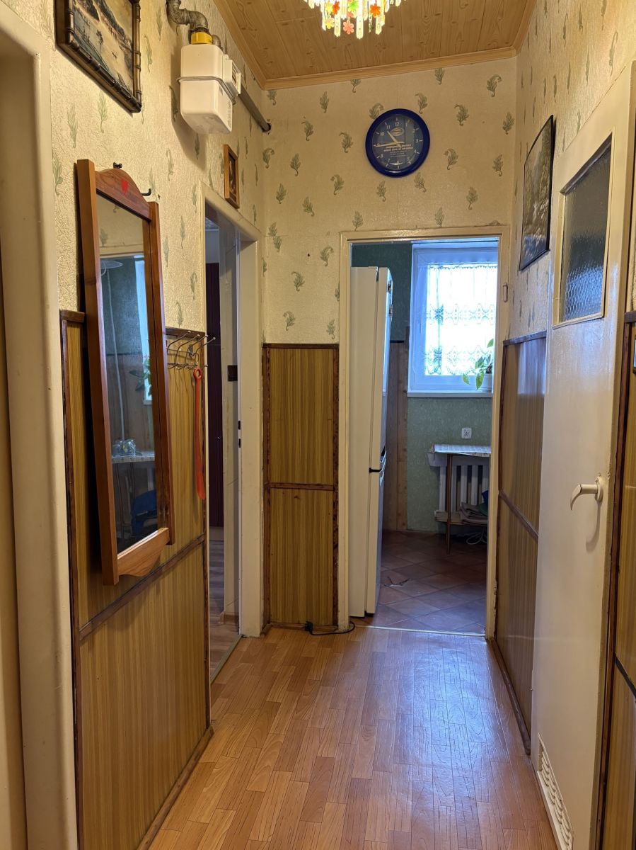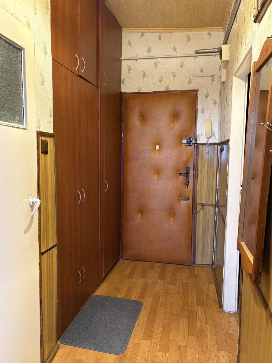 - przedpokój: ściany płyta i tapeta, podłoga wykładzina, szafa wnękowa