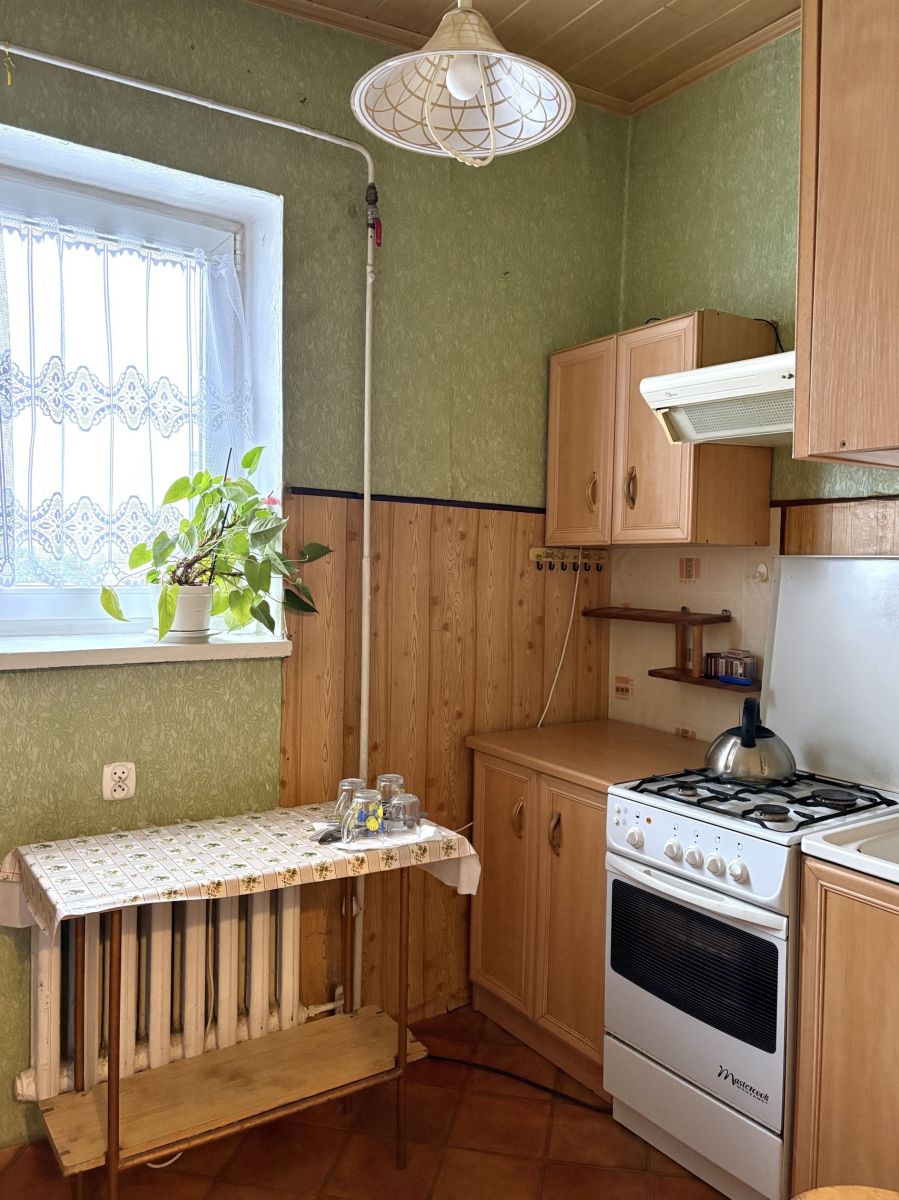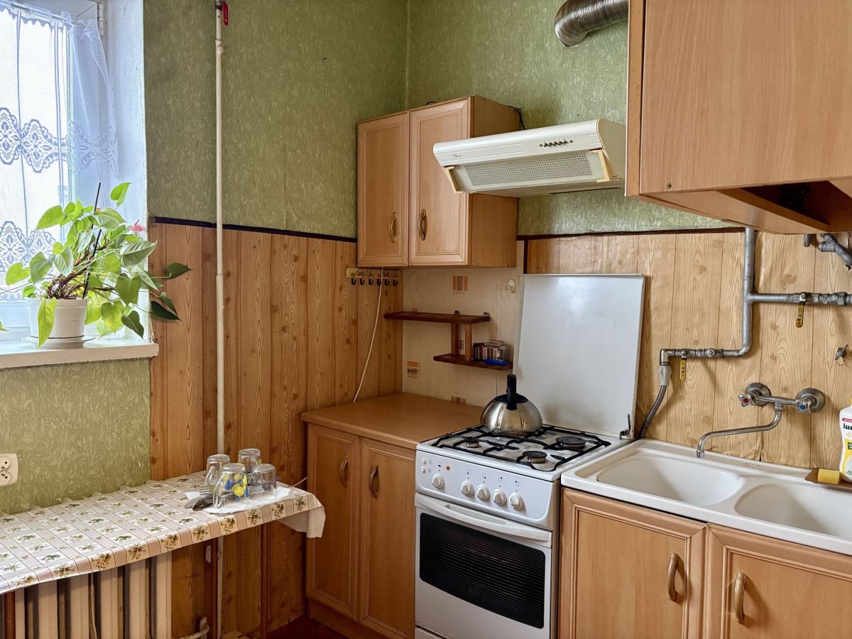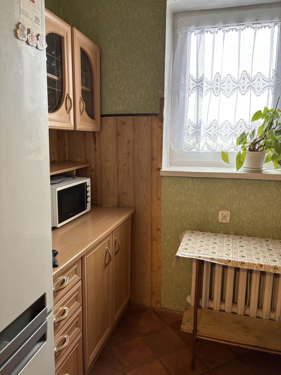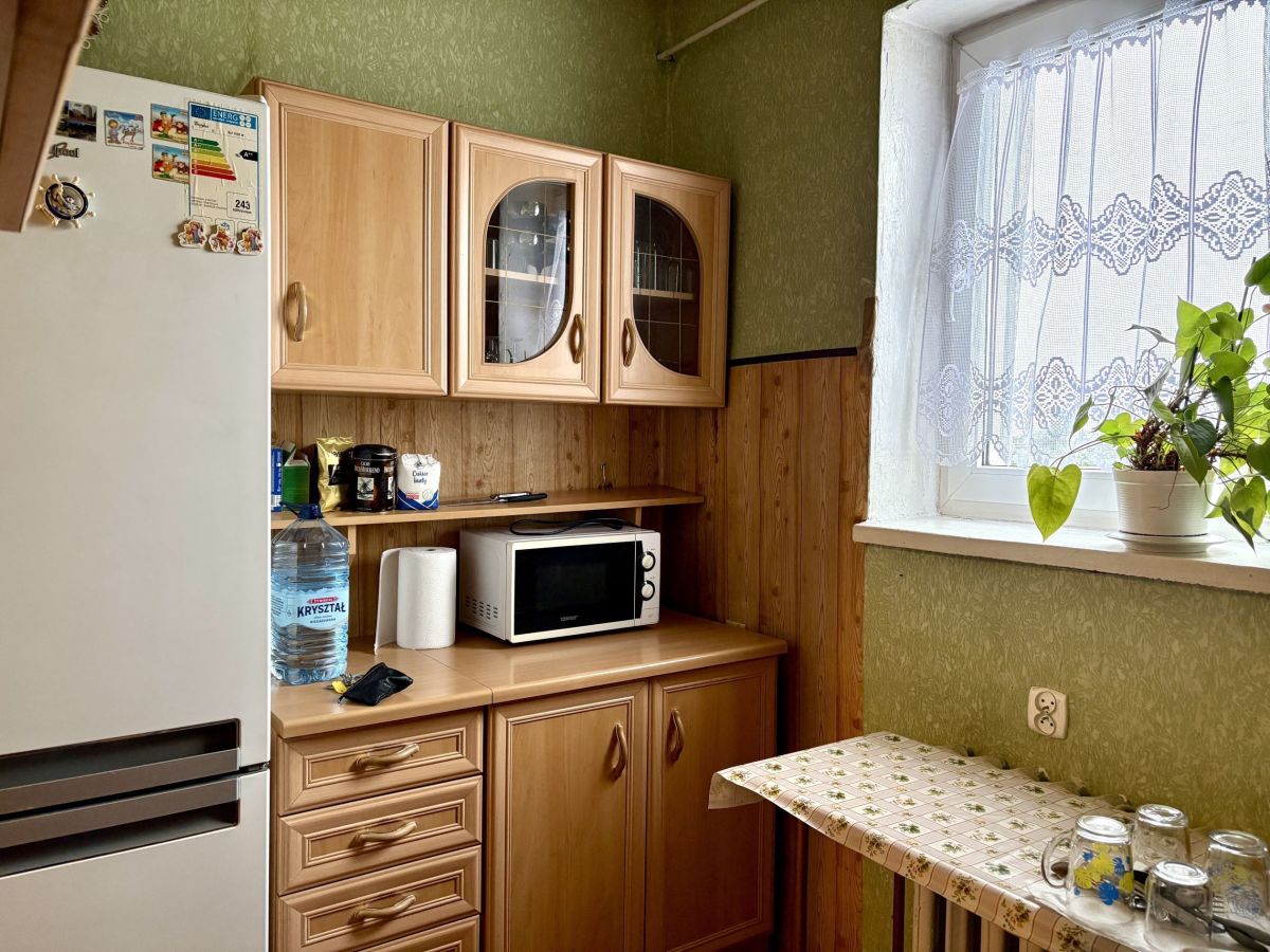 - kuchnia widna: ściany tapeta, podłoga wykładzina PCV, meble kuchenne