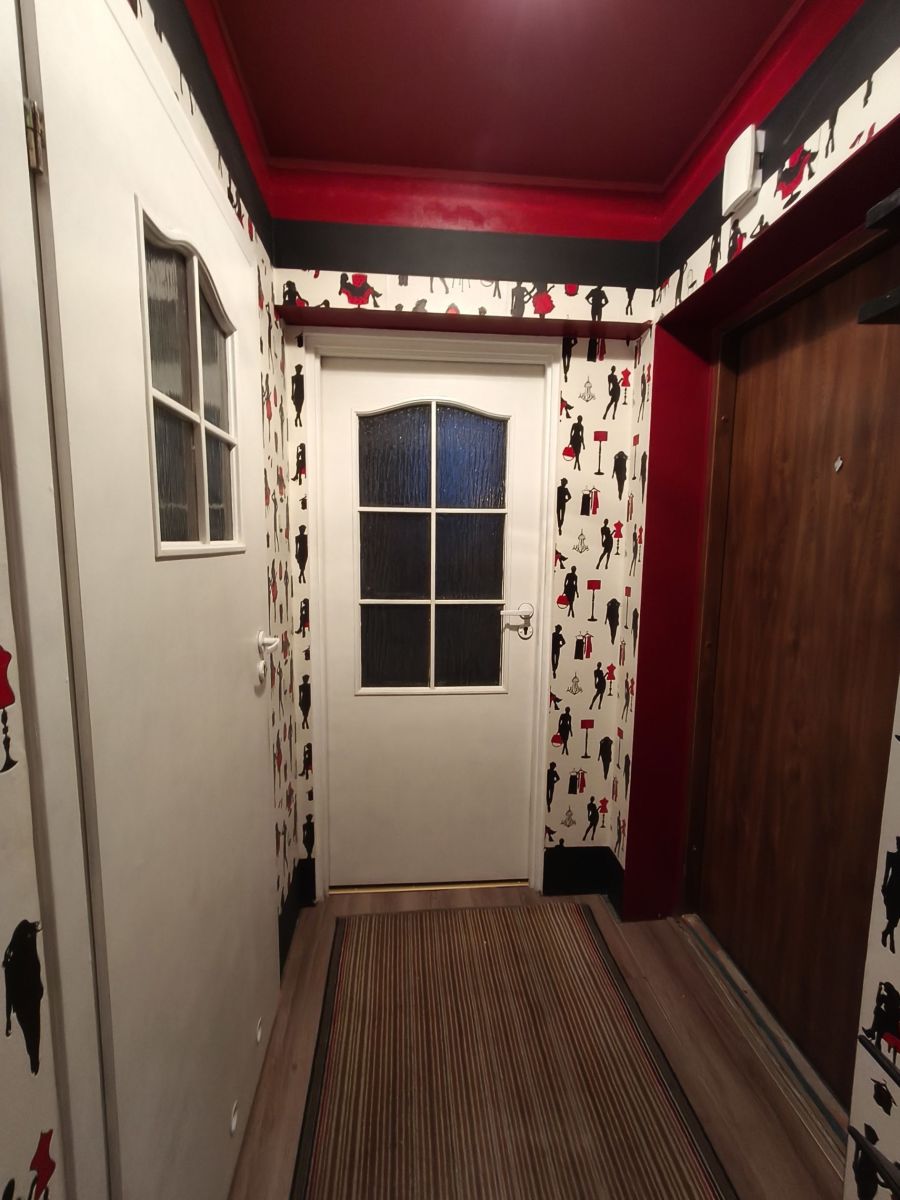 - salon: ściany tapeta i gładź, podłoga panel, wyjście na loggię